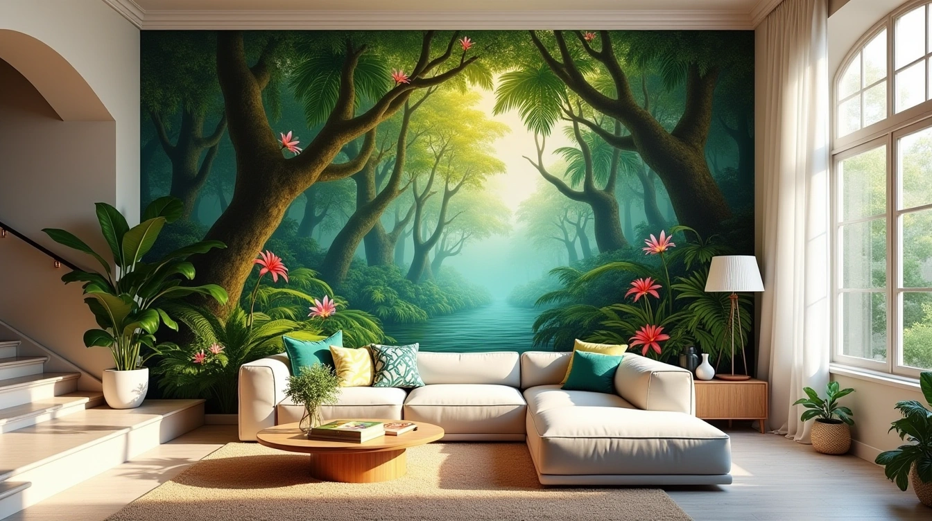Les motifs de forêt tropicale transforment instantanément votre intérieur en véritable havre de paix. Cette décoration murale apporte une dimension naturelle qui apaise l’esprit et invite à l’évasion quotidienne, loin du stress urbain.